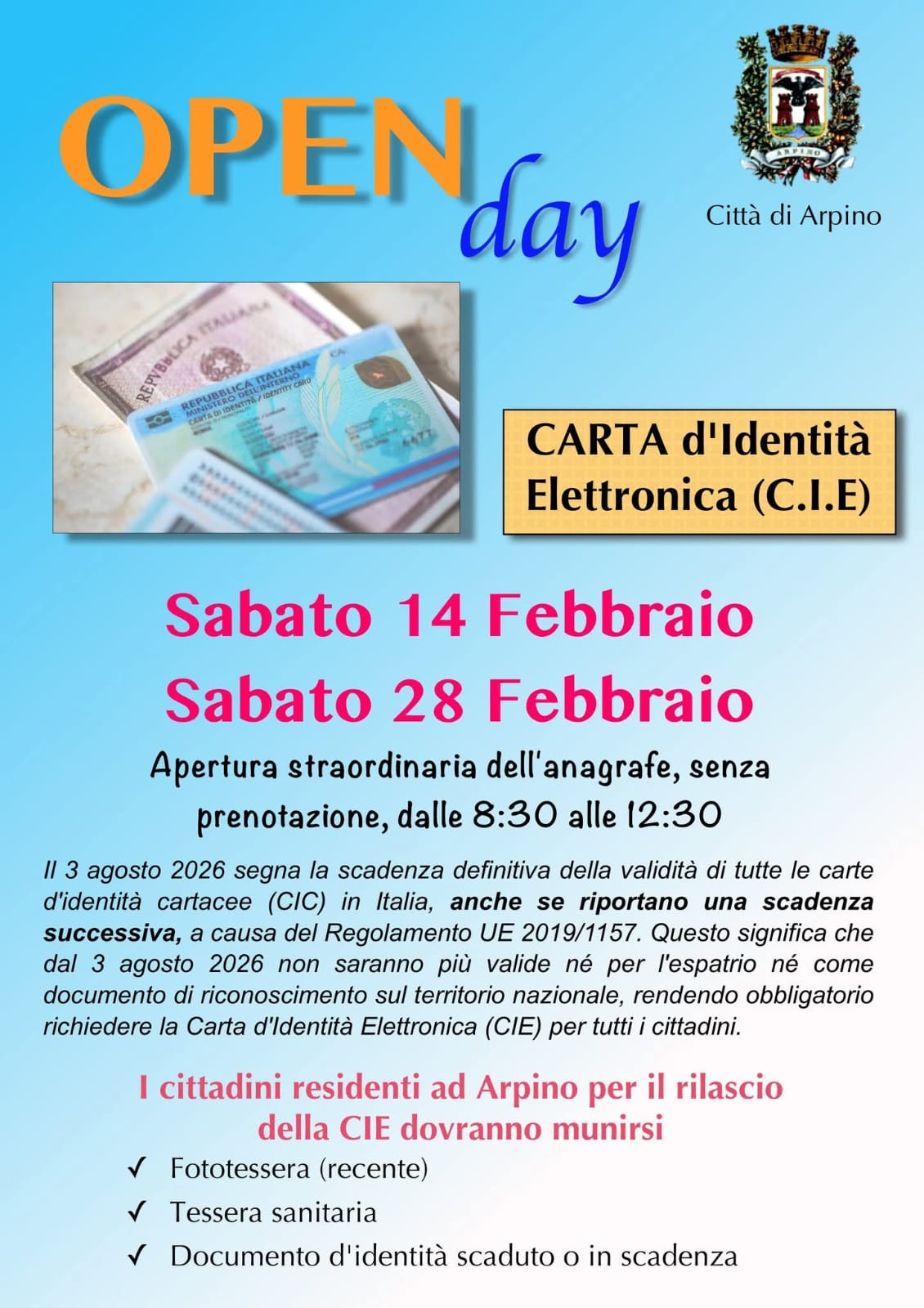 OPEN DAY, sabato 14 FEBBRAIO 2026 e sabato 28 FEBBRAIO 2026 apertura straordinaria anagrafe senza prenotazione, DALLE ORE 8.30 ALLE ORE 12.30, senza prenotazione CARTE D'IDENTITA'